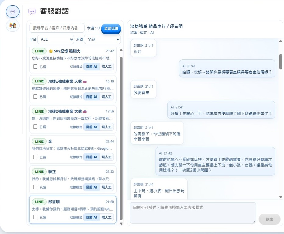 台湾の中小企業向けに設計された AI カスタマーサービスです。LINE・Facebook・Instagram を統合し、24 時間自動応答と成約意図分析を行います。